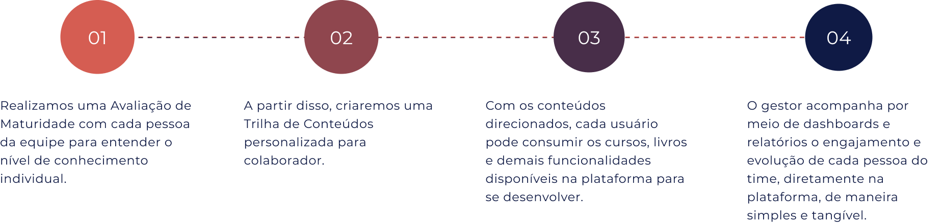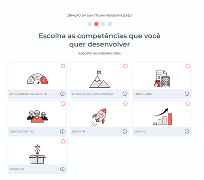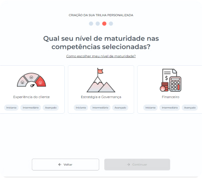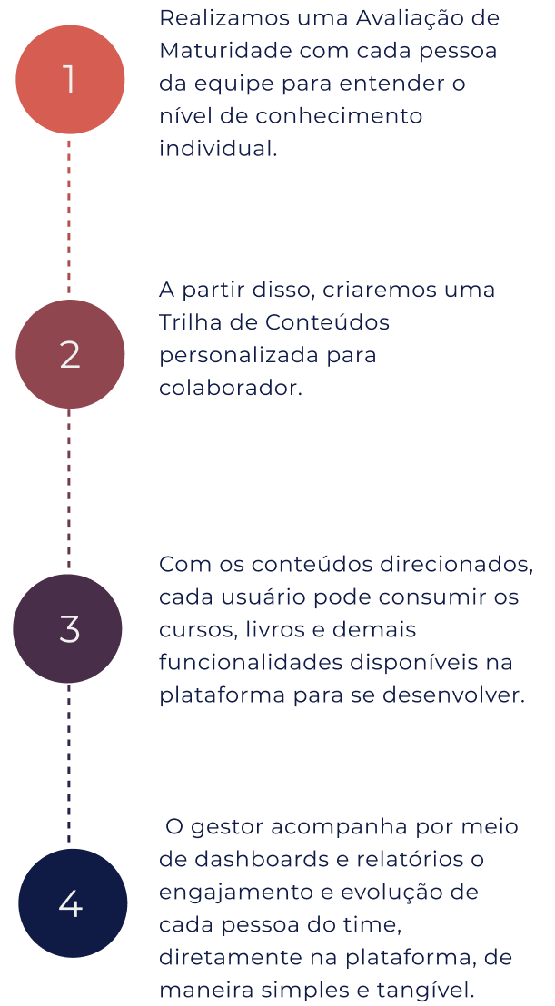 Temos uma Inteligência Artificial que mapeia o nível de habilidade de cada pessoa do time, em diferentes áreas de conhecimento. A partir dessa Avaliação de Maturidade, é criada a Trilha de Conteúdos para desenvolver cada pessoa de maneira única e personalizada.