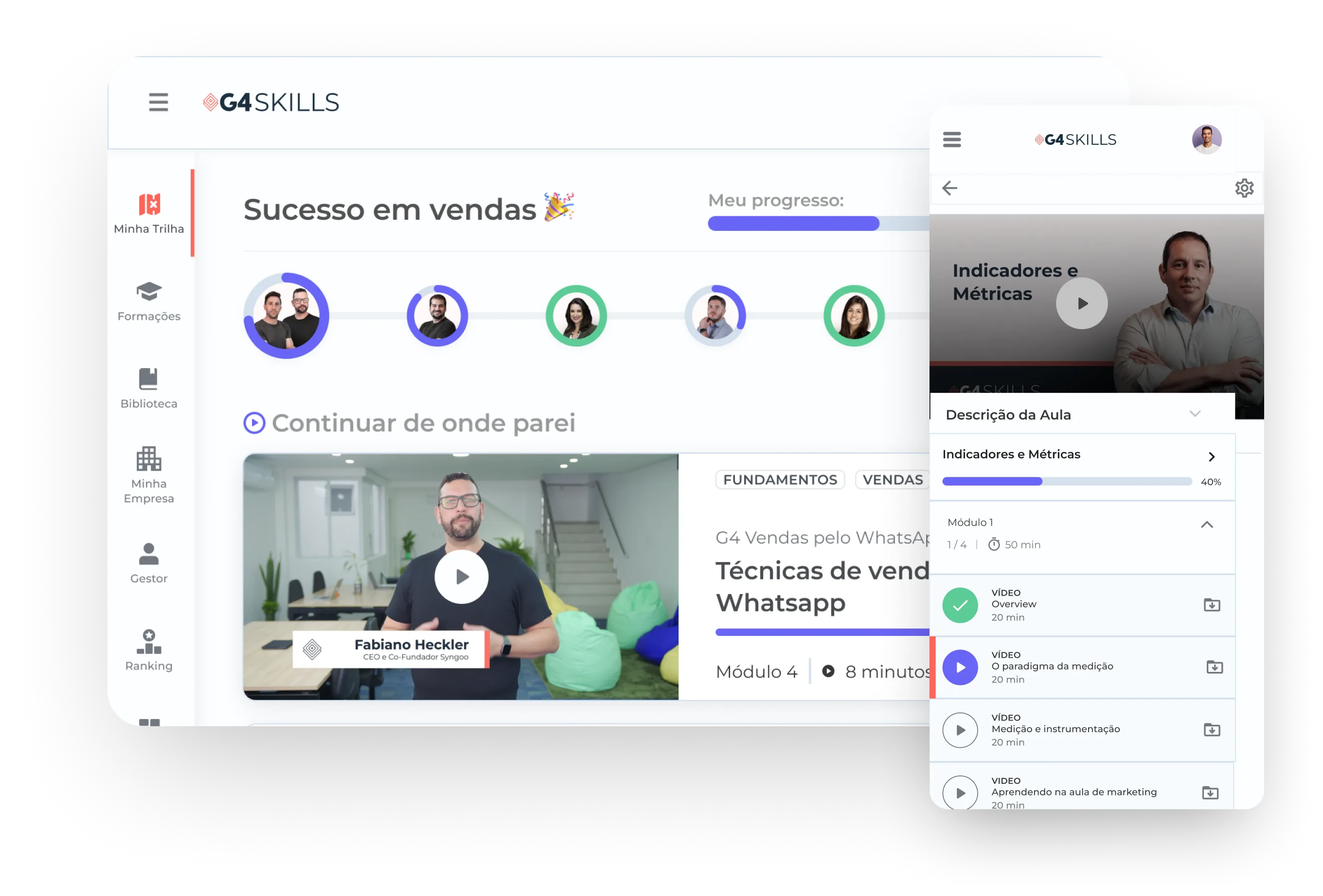 Conteúdos de valor e com temas relevantes para diversas áreas da empresa. Todas as formações, cursos e módulos disponíveis na plataforma são produzidos pelo próprio G4, com mentores especialistas.