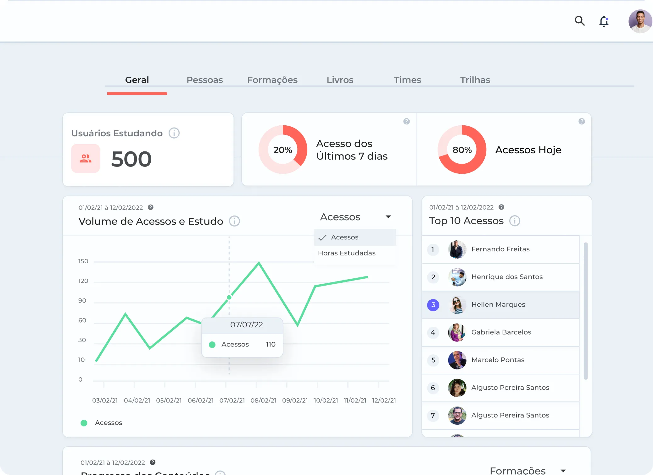 Tudo que o colaborador realiza dentro da plataforma fica disponível exclusivamente para o gestor, em dashboards e relatórios que mostram o engajamento do time, quais conteúdos cada usuário consumiu e o quanto estão comprometidos com o próprio desenvolvimento.
