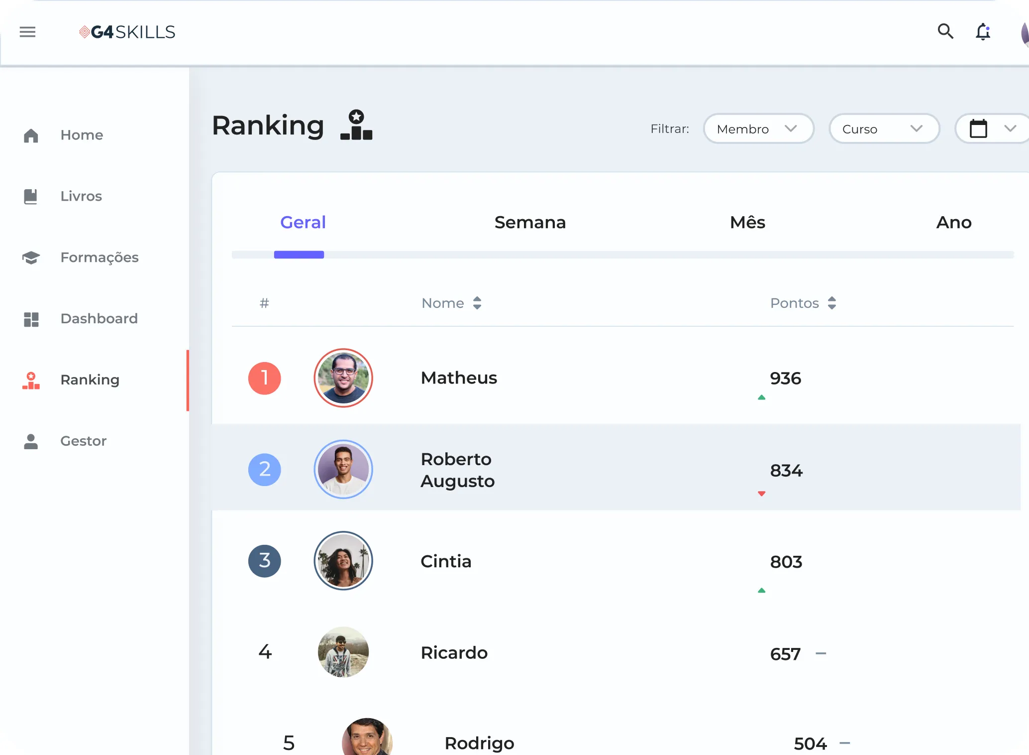 Toda atividade do usuário dentro da plataforma recebe uma pontuação. Esses pontos são contabilizados em um ranking, elencando os colaboradores mais engajados no período do ano, mês e semana. Esse sistema fica visível para todos e estimula o aprendizado dos colaboradores.